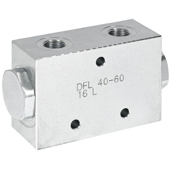 Arbetstryck: 250 barFlödesdelaren delar flödet i två lika stora delar t.ex. till två cylindrar.
