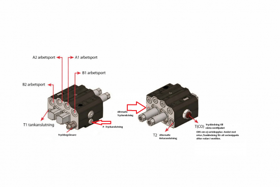 LS-ventilslang som ska läggas från LS-porten till pumpreglaget. Slangen kan anslutas till LS-ledningen i systemet med en alternerande ventil. - I produktgrupper