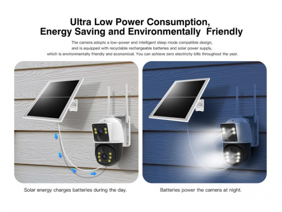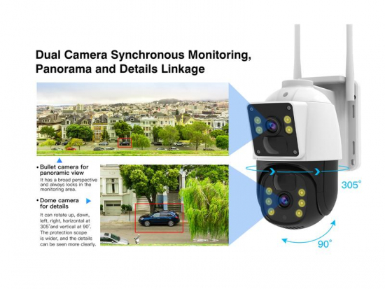 Utrustad med två separata vidvinkellinser i HD-kvalitet erbjuder systemet ett dubbelt skydd: en kamera med fast vy ger en överblick över området, medan en andra pan-tilt-zoom-kamera kan justeras för att fokusera på specifika vinklar eller objekt vid behov. Allt visas i delad skärm via den tillhörande mobilappen.