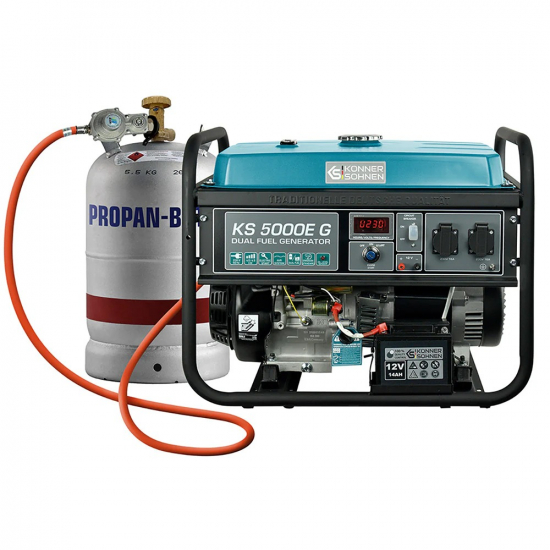 LagerstatusArtikelnummerKS5000EGTillverkareKönner & SöhnenEgenskaperEffekt (kW): 4,5DUAL FUEL-serien LPG/bensindrivna generatorer från Könner & Söhnen är mycket populära tack vare sin effektivitet, flexibilitet och mer miljövänliga drift. Generatorn kan drivas både med bensin och flytande gas (propan-butan), vilket ger lägre bränslekostnader och minskade utsläpp. Drift på gas minskar dessutom motorbelastningen och kan bidra till längre livslängd.